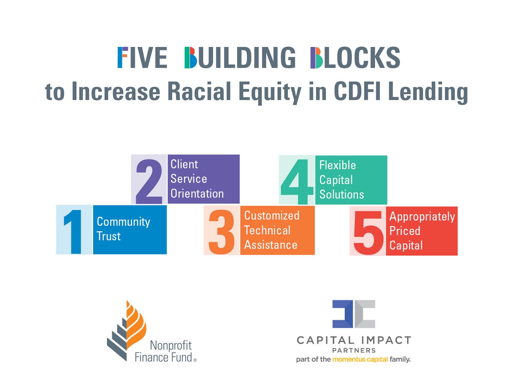 In line with this commitment, and in recognition of discriminatory lending practices identified within CDFIs, Capital Impact Partners collaborated with Nonprofit Finance Fund (NFF) to identify and address policies and practices that contribute to it. They conducted research to understand how some local and national CDFIs have successfully taken steps to address inequity within their own lending practices.